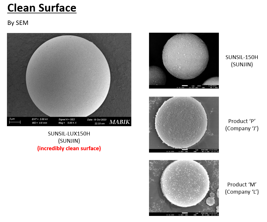 SUNSIL-LUX 시리즈는 시장의 다른 실리카들과 비교했을 때, 탁월하게 깨끗한 표면을 가지고 있습니다. 이는 SUNSIL-LUX시리즈만의 특별한 제조 공정으로 인해 가능합니다.