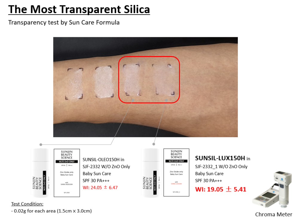 또한, 선케어 처방에 실리카를 2g 사용하여 비교한 결과, SUNSIL-LUX150H를 사용했을 때 더욱 투명한 처방을 개발할 수 있었습니다.
