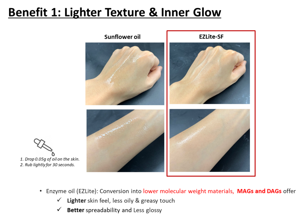 EZLite-SF는 Bioconversion 기술을 통해 분자량이 큰 TAG는 줄이고, 작은 MAG와 DAG의 비율을 높여 사용감이 더욱 가볍고 피부 흡수가 빠른 것이 특징입니다.