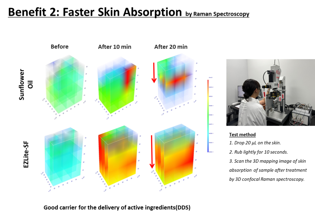 Raman Spectroscopy 분석으로 해바라기유와 피부흡수도 차이점 비교 결과 EZlite-SF가 더욱 빠르게 진행됨을 확인할 수 있었습니다.