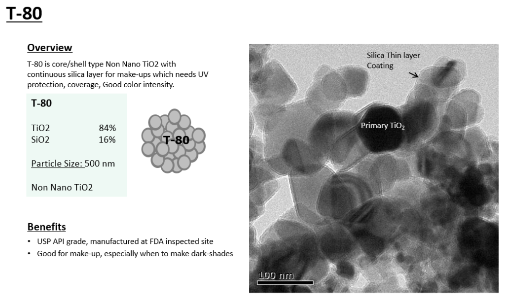T-80시리즈는 연속적인 실리카 층으로 둘러싸여있는 Core/shell 타입의 논나노 TiO2 입니다. 이러한 구조적 특성으로 인해 자외선 차단 지수를 가진 메이크업 제품에 적용할 시 Pigment TiO2 보다 자외선 차단 능력이 뛰어납니다.