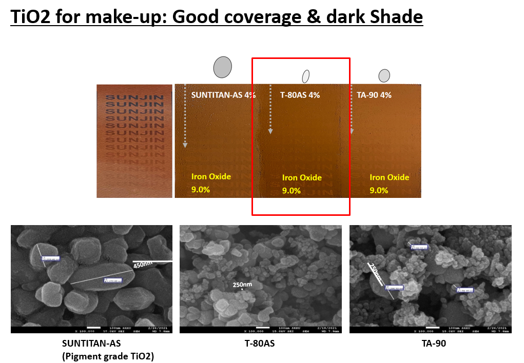이번 호에서는 자외선 차단력과 커버력을 동시에 향상 시킬 수 있고 특히 어두운 색 표현이 필요한 메이크업 처방에 특화된 TiO2, T-80 시리즈를 소개해드리겠습니다.