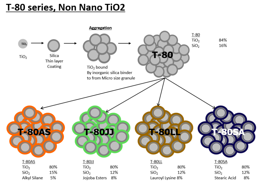 T-80시리즈는 T-80(무코팅), T-80AS(Alkyl Silane 코팅), T-80JJ(JoJoba Ester 코팅), T-80LL(Lauroyl Lysine 코팅), T-80SA(Stearic Acid 코팅) 제품으로 이루어져 있으며 처방에 따라 선택적으로 사용하실 수 있습니다.