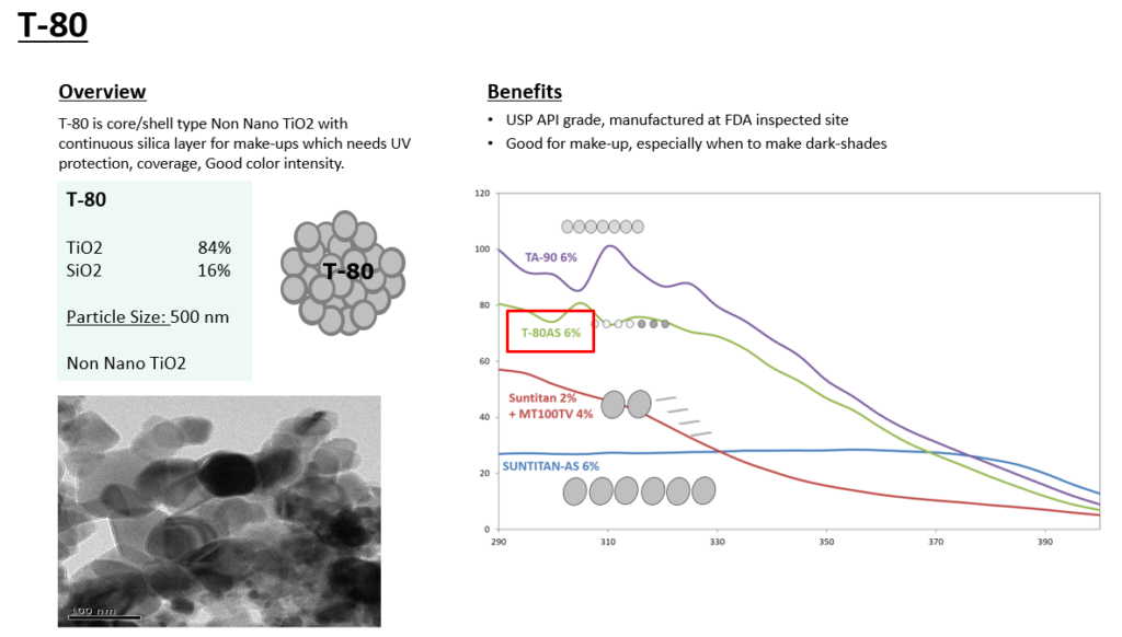 T-80시리즈는 연속적인 실리카 층으로 둘러싸여있는 코어셸 타입의 논나노 TiO2 입니다. 자외선 차단 지수를 가진 메이크업 제품에 적용할 시 Pigment TiO2 보다 높은 자외선 차단력을 나타낼 수 있습니다.