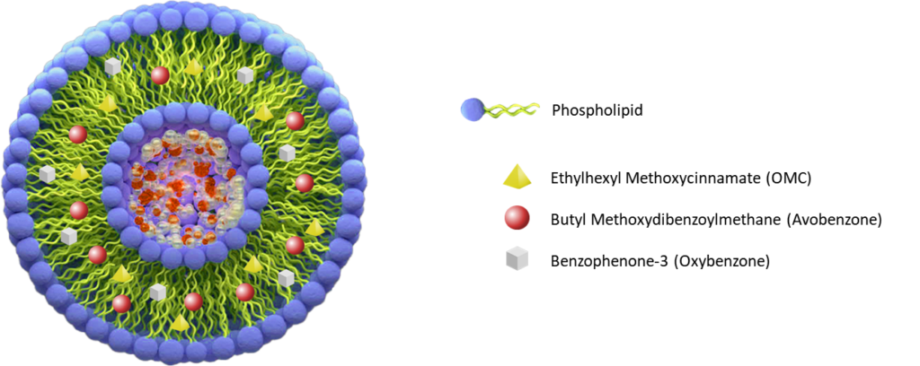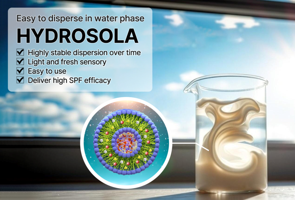 HYDROSOLA-AOB 는 유기 자외선 필터를 다중층 구조로 안정하게 감싸 피부 자극을 줄이는 동시에 O/W 제형의 수상(Water phase)에 유기 자외선 필터 분산이 가능합니다.