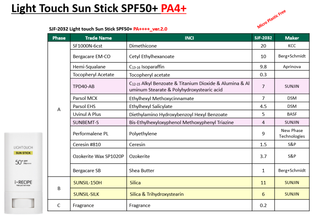라이트 터치 선스틱은 기존의 유기자외선 차단제를 사용하여 오일리한 사용감을 가진 선스틱에 Micro bead와 티타늄다이옥사이드분산액을 사용하여 보송하고 산뜻한 사용감이 특징입니다.