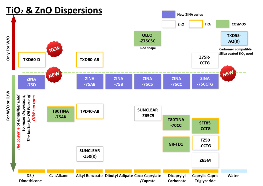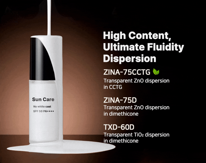 ZINA-75CCTG: 천연 컨셉의 ZnO 분산액 ZINA-75CCTG는 75% ZnO 파우더를 카프릴릭/카프릭 트리글리세라이드(Caprylic/Capric Triglyceride)에 분산시킨 COSMOS, NaTrue grade 제품입니다. 탁월한 투명도를 자랑하며, 자연 유래 성분을 선호하는 제형에 이상적인 선택입니다.