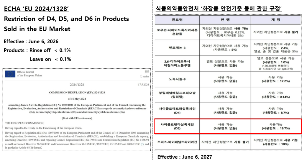 유럽은 2026년 6월부터, 국내 식품의약품안전처 또한 2027년 6월부터 D5 사용 규제를 강화할 예정입니다. ZINA-75D와 TXD60-D는 이러한 전 세계적인 추세에 발맞춰 D5를 디메치콘(Dimethicone)으로 대체하여 개발된 투명한 ZnO 및 TiO2 분산액 입니다. 강화되는 규제 걱정 없이 안심하고 사용할 수 있는 솔루션을 제공합니다.