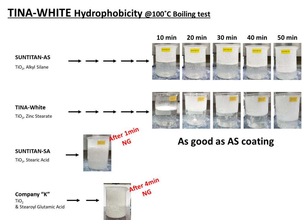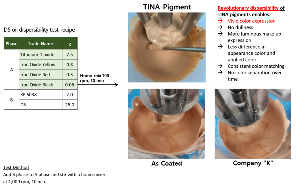 TINA 시리즈는 천연 코팅 제품임에도 불구하고 피그먼트 코팅에 일반적으로 사용되는 Alkyl Silane 코팅 피그먼트와 동등한 수준의 발수력을 제공합니다. 이를 바탕으로 Long-lasting 효과를 갖는 처방 제작에 적합하면서도 Clean Beauty 컨셉을 유지할 수 있다는 장점이 있습니다.