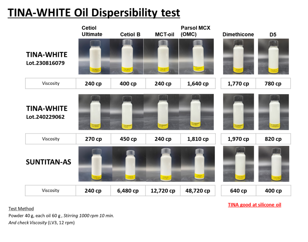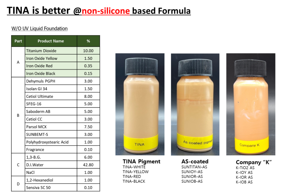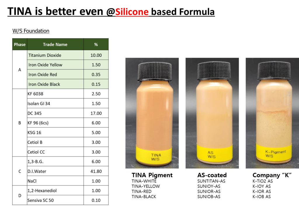 또한, TINA 피그먼트를 사용한 실리콘 처방과 실리콘 프리 처방은 Alkyl Silane 코팅 피그먼트를 적용한 처방에 비해 훨씬 우수한 처방 안정성을 보여줍니다.