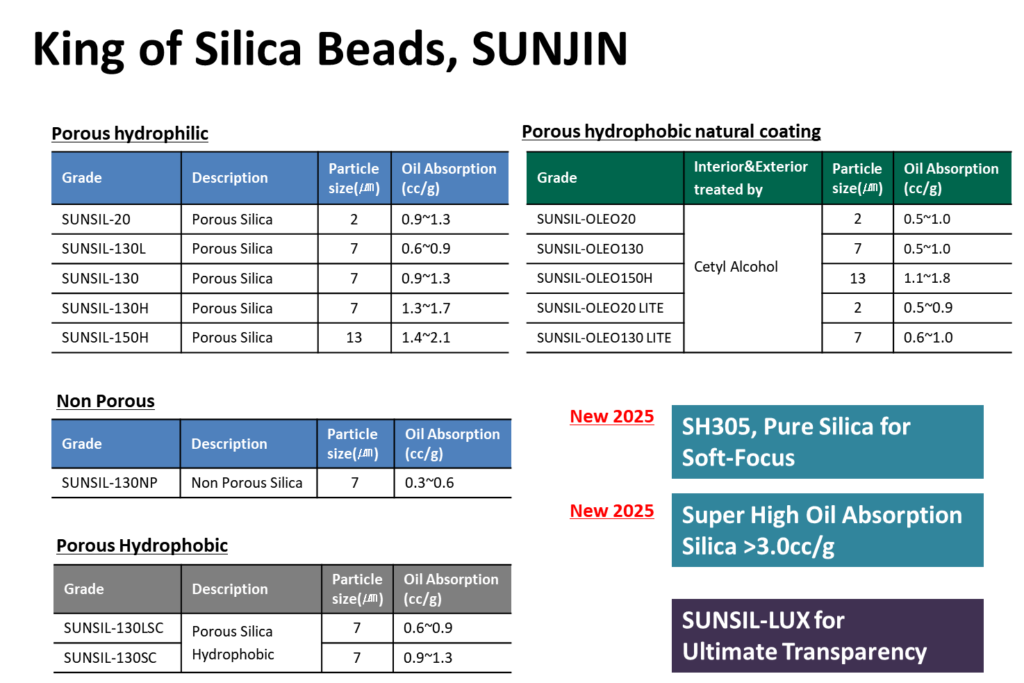 뿐만 아니라, 선진뷰티사이언스는 기존의 논코팅 실리카, 메티콘 및 세틸알코올 코팅 실리카는 물론, 최고 수준의 투명도를 자랑하는 SUNSIL-LUX 시리즈를 제공하고 있습니다.