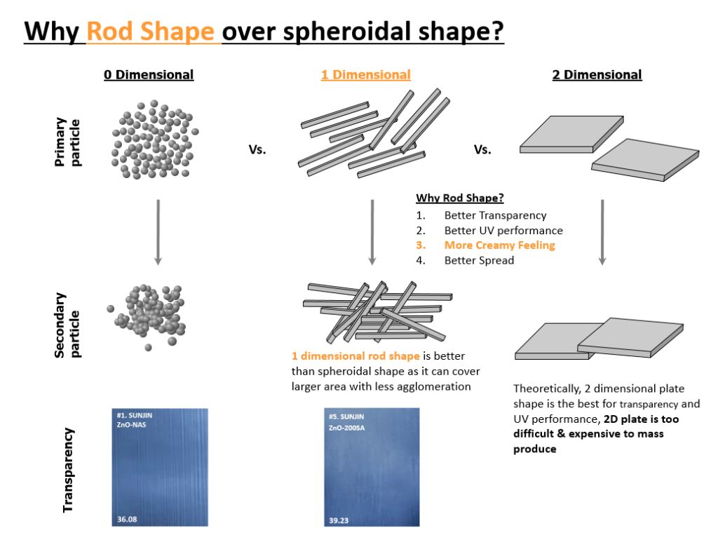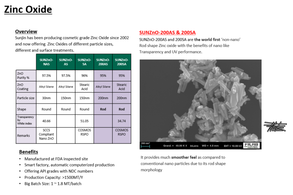 SUNZnO-200AS와 SUNZnO-200SA는 각각 Triethoxy caprylylsilane 및 Stearic Acid로 표면처리 된 막대형 징크옥사이드 입니다.
