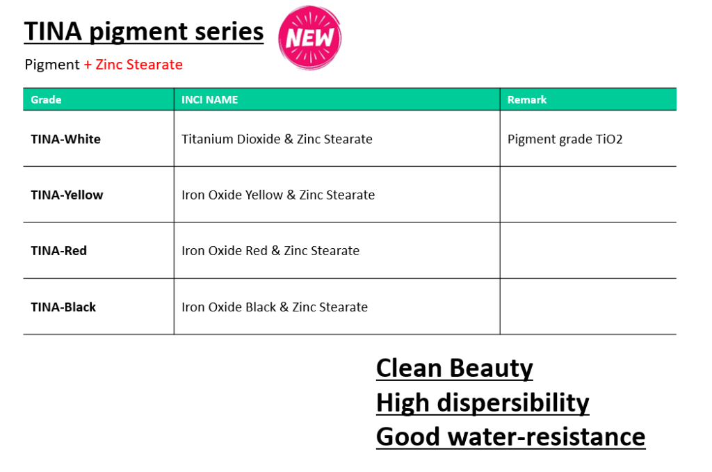TINA 시리즈란? 클린뷰티 컨셉의 천연코팅 피그먼트 신제품으로, 피그먼트 티타늄다이옥사이드 및 황색, 적색, 흑색 산화철에 Zinc Stearate를 표면 처리한 제품 입니다.