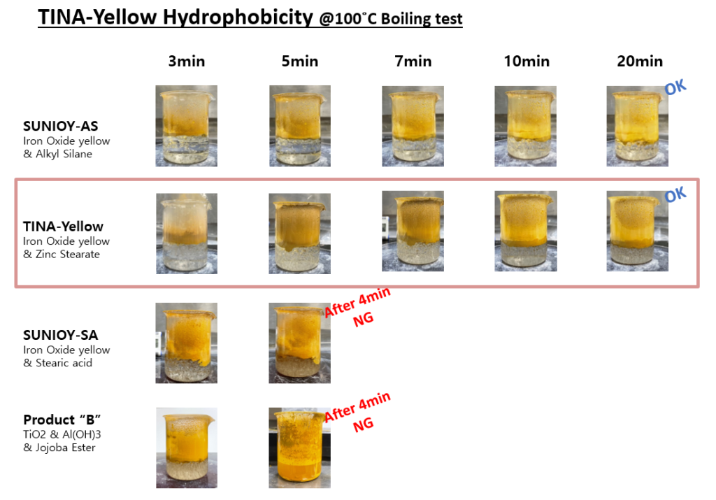 TINA 시리즈는 기존에 보편적으로 사용되던 Alkyl Silane코팅의 피그먼트들과 동등한 수준의 발수력을 가지고 있으면서, 클린뷰티 컨셉에 맞는 천연 코팅이라는 이점이 있습니다.
