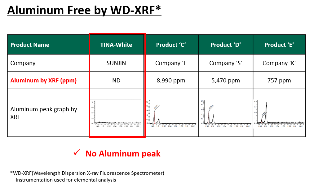 또한 TINA-White는 알루미늄이 포함되어 있지 않아, 알츠하이머 이슈에서 자유로울 수 있습니다. XRF로 분석한 결과, TINA-White에서는 알루미늄 피크가 관찰되지 않았습니다.