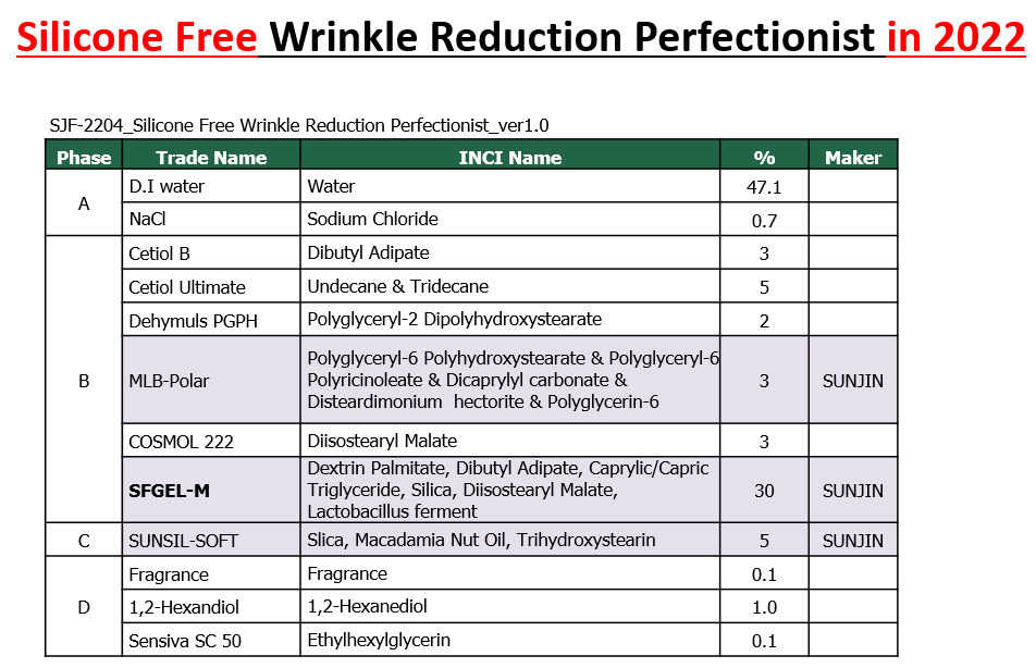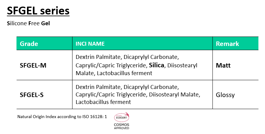 SFGEL 시리즈는 실리콘젤이 사용되는 기존의 실리콘 베이스 처방에 실리콘젤을 대신하여 사용함으로써 동일한 사용감을 가진 실리콘 프리 처방 제작이 가능한 제품 입니다.