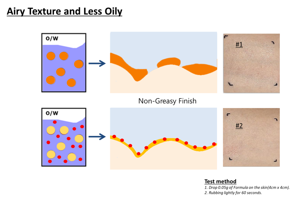 실리카 파우더에 담지된 SUNSIL-AB는 제형의 끈적임이나 유분감을 현저히 줄여줍니다. 기존 유기자차에서 느껴지던 묵직한 사용감을 개선하여, 가볍고 부드러운 마무리감을 제공함으로써 사용자 만족도를 높일 수 있습니다.