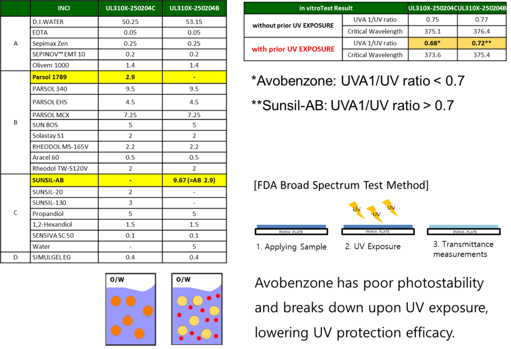 SUNSIL-AB는 실리카 매트릭스가 아보벤존의 분해를 억제하여 광안정성을 크게 향상시킵니다. 실제로 광조사 후에도 UVA/UVB 전 영역에서 우수한 자외선 차단 효능이 유지되어 미국 FDA 기준의 Broad Spectrum 요건을 충족하는 것으로 확인되었습니다.