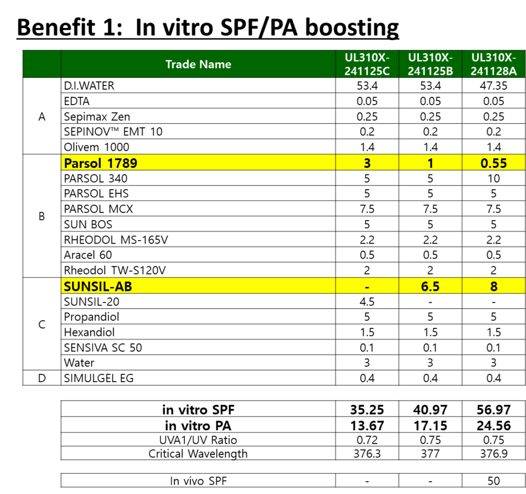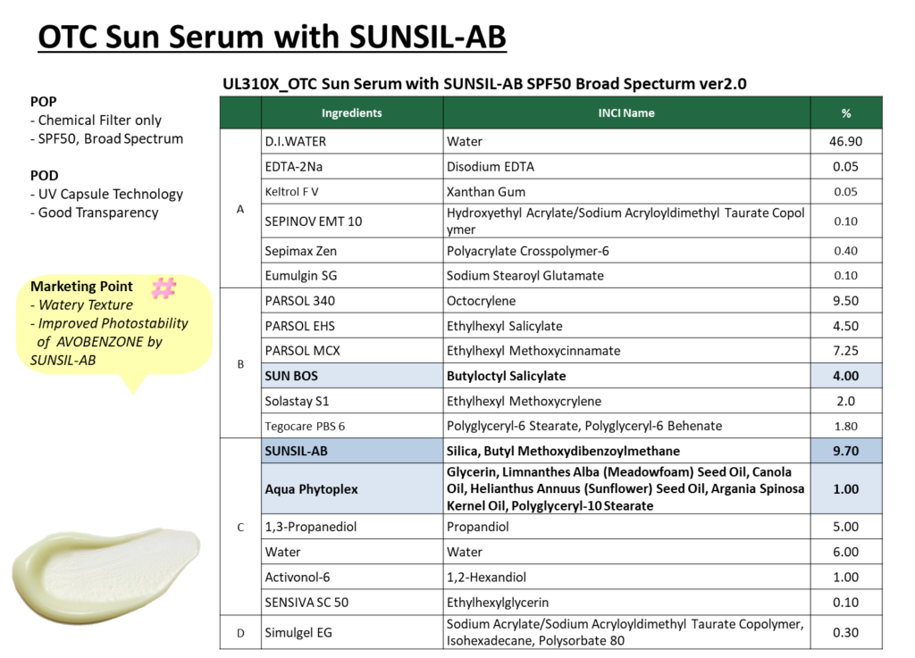 SUNSIL-AB를 9.7%(아보벤존 약 3%)와 다른 유기자차를 함께 사용하면, SPF 50 및 미국 OTC Broad Spectrum 요건을 모두 만족하는 선세럼 제형을 구현할 수 있습니다. 이는 SUNSIL-AB가 고기능성 선케어 제품 개발을 위한 핵심 원료임을 입증합니다.