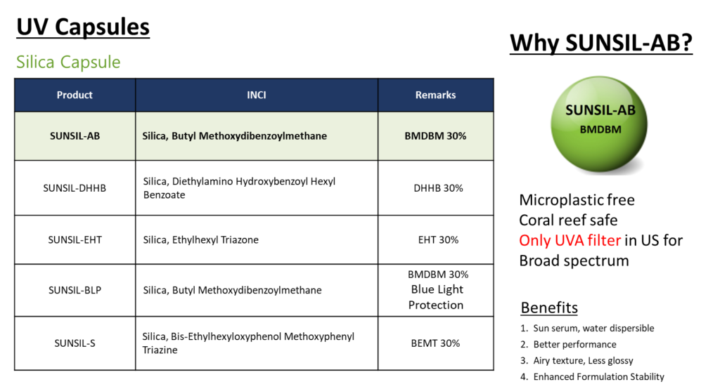 SUNSIL-AB는 제형 유연성, 사용감 개선, 광안정성, 그리고 뛰어난 UV 차단 효과까지 모두 갖춘 혁신적인 아보벤존 솔루션입니다. 미국 OTC 시장 진출을 목표로 하는 고기능성 선케어 제품 개발에 최적의 선택이 될 것입니다.