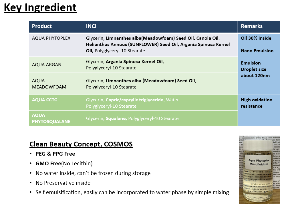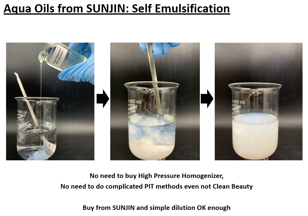 AQUA Oil 시리즈는 고압의 Homogenizer 및 가열 공정 없이 물에 간단히 풀어 사용하실 수 있는 나노 에멀젼 원료 입니다.