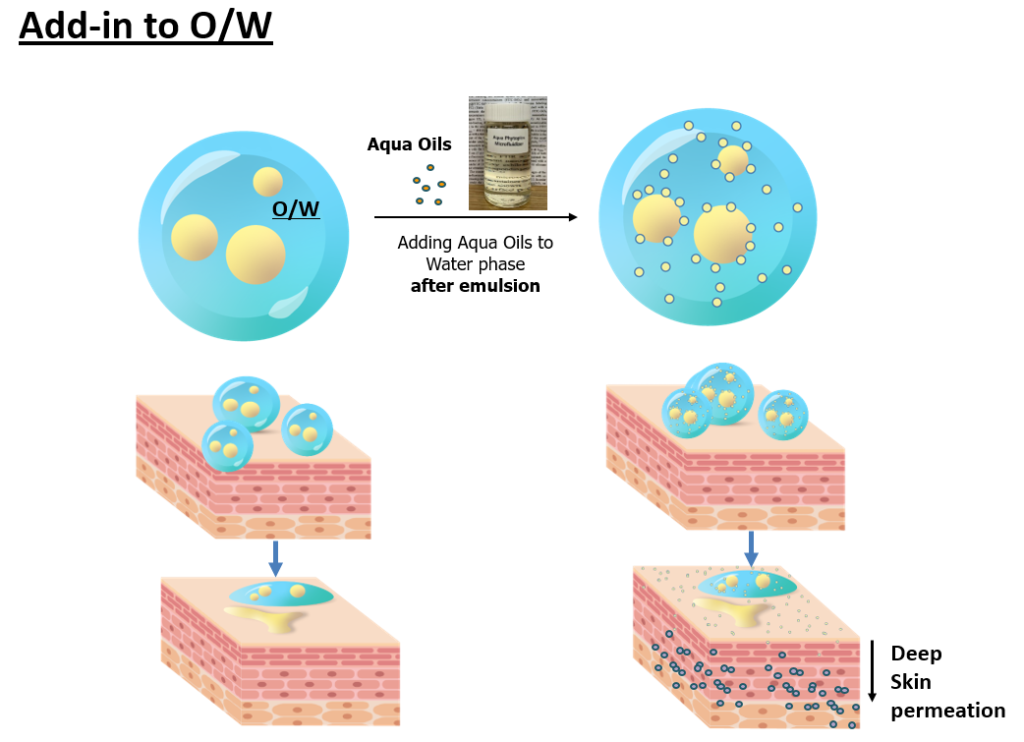 O/W 처방 유화 후, AQUA Oil을 첨가하면 일반적인 유화 시스템에 비해 보다 깊숙이 나노화 된 오일 입자들이 피부에 침투 됩니다.