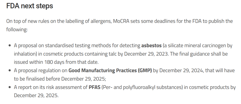MoCRA에는 화장품 원료 제조사에 대한 규제사항이 없지만 Product listing을 하는 OEM/ODM사, 브랜드사들은 사실상 GMP 규정을 준수하는 시설에서 제조된 원료를 사용해야 될 것 입니다.