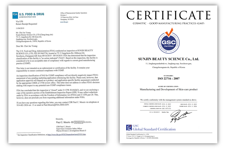 선진뷰티사이언스는 API에 대한 미국 FDA 실사에서 지적 사항 없이 가장 우수한 NAI(No Action Indicated) 등급을 받았으며, 화장품 산업에서 우수한 제조 및 품질관리 기준(GMP)을 위한 국제표준규격인 ISO 22716 인증을 획득하였습니다. 따라서, 선진뷰티사이언스의 화장품 원료를 사용하신다면 복잡한 MoCRA 규제를 보다 수월하게 통과하실 수 있습니다.