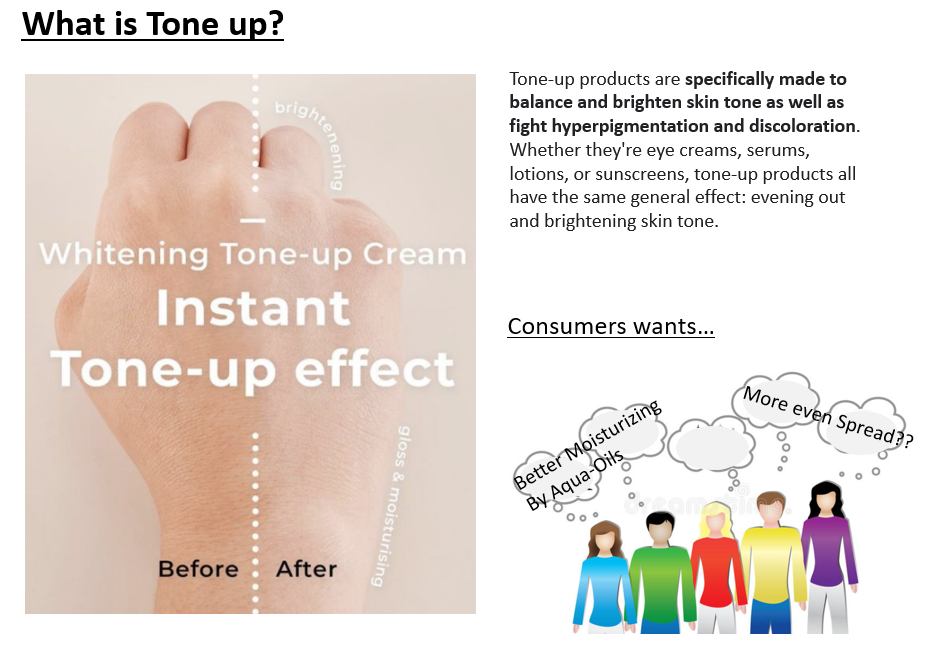 소비자들이 톤업 크림을 피부에 발랐을 때 가장 원하는 점은 뭉치거나 골끼임 현상이 없는 자연스럽고 균일한 톤업 효과를 얻는 것과 수분감 있는 촉촉한 사용감입니다.