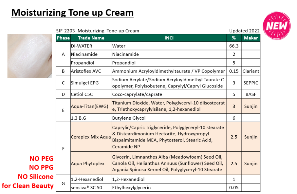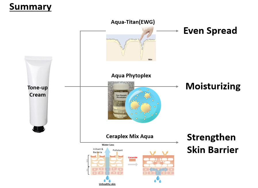 한 톤업 크림에 즉각적인 보습력을 부여하기 위해 미세 유화 시스템 기술로 개발한 나노 에멀젼 제품인 AQUA-Phytoplex를 2.5% 사용하였습니다. 또한 Ceraplex Mix AQUA를 2.5%함께 사용하여 손상된 피부 장벽을 강화하고 부드러운 발림성을 더해주었습니다.