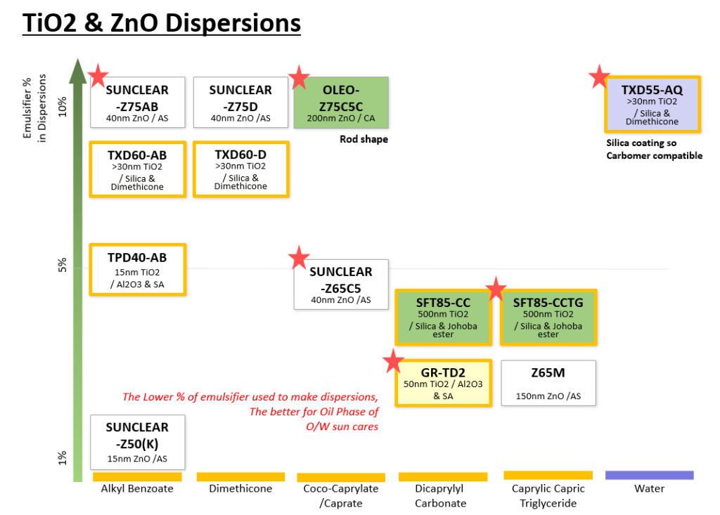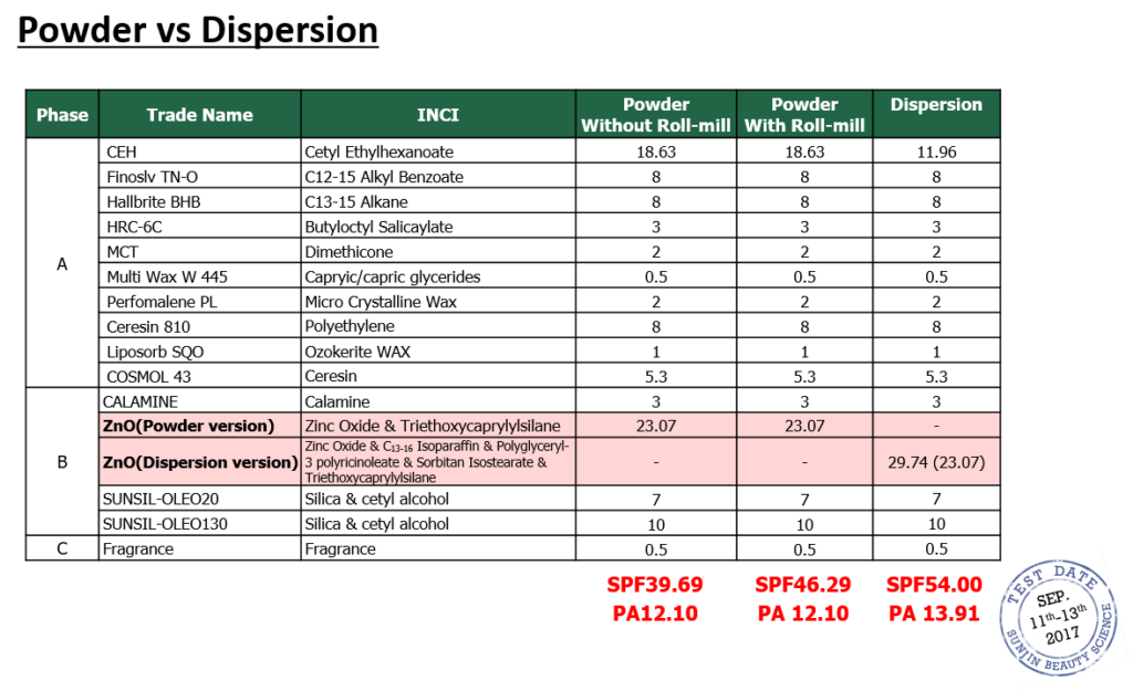 자외선 차단 제품의 차단력을 향상 시키기 위해서는 파우더 형태의 자외선 차단제를 쓰는 것 보다, 분산액을 사용하는 것이 좋습니다. 파우더 형태와 분산액을 동일 ZnO 함량 기준으로 사용하였을 때, 분산액을 사용한 경우가  높은 SPF 및 PA 지수를 나타내었습니다.
