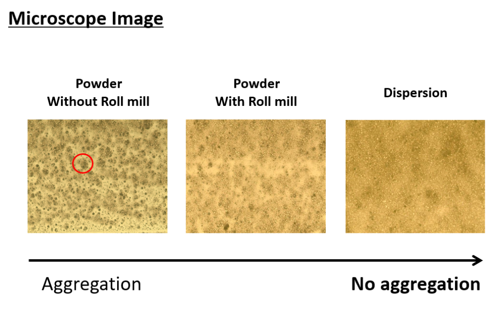 분산액을 사용했을 때 자외선 차단력이 향상되는 이유는 현미경 사진으로 설명 드릴 수 있습니다. 분산액을 사용했을 때 자외선 차단 제품이 뭉치는 것 없이 분산이 더 잘되어 자외선 차단력 또한 높아지는 것을 알 수 있습니다.