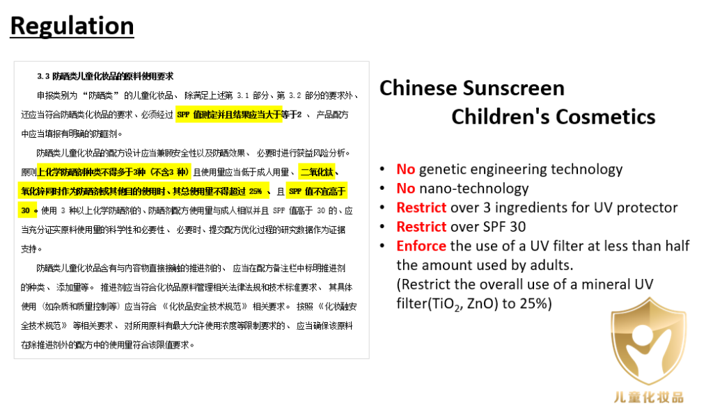 중국에서 어린이용 자외선 차단 화장품의 경우, 크게 다섯 가지 항목을 준수해야 합니다. 1. 유전 공학 기술을 사용하지 않을 것, 2. 나노 기술을 사용하지 않을 것, 3. 자외선 차단 원료를 3가지 이상 사용하지 않을 것, 4. SPF는 30을 초과하지 않을 것, 5. 자외선 차단 원료를 성인의 반 수준만 사용할 것 입니다.