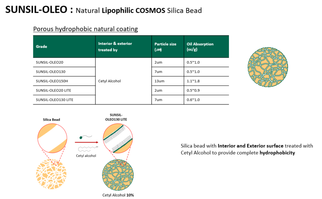 SUNSIL-OLEO 시리즈는 자연 유래 원료인 실리카에 Cetyl Alcohol을 외부와 내부에 모두 처리하여 친유성인 동시에 흡유성을 띄고 있습니다.