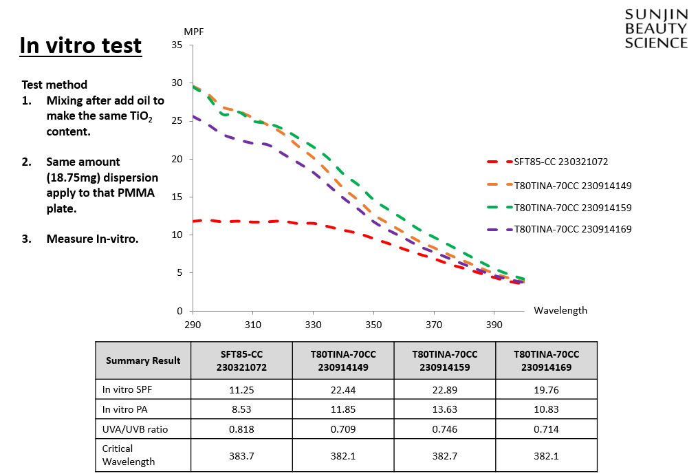 T80TINA-70CC의 자외선차단력을 확인하기 위하여 분산액의 TiO2 함량을 동일하게 조정하여 In-vitro 측정을 진행한 결과, SPF와 PA 모두 기존 SFT85 시리즈에 비해 크게 향상되었습니다.