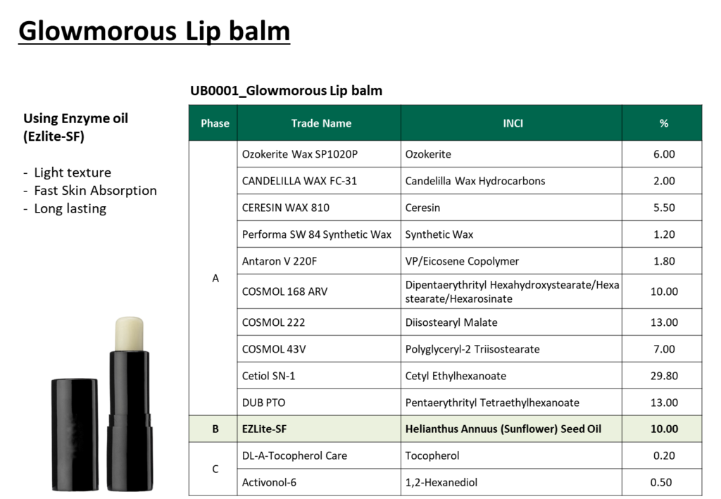 이번 호에서는 혁신적인 효소 오일(EZlite-SF)을 사용하여 차원이 다른 촉촉함과 지속력을 선사하는 ‘글로우모러스립밤’을 소개해드리겠습니다.