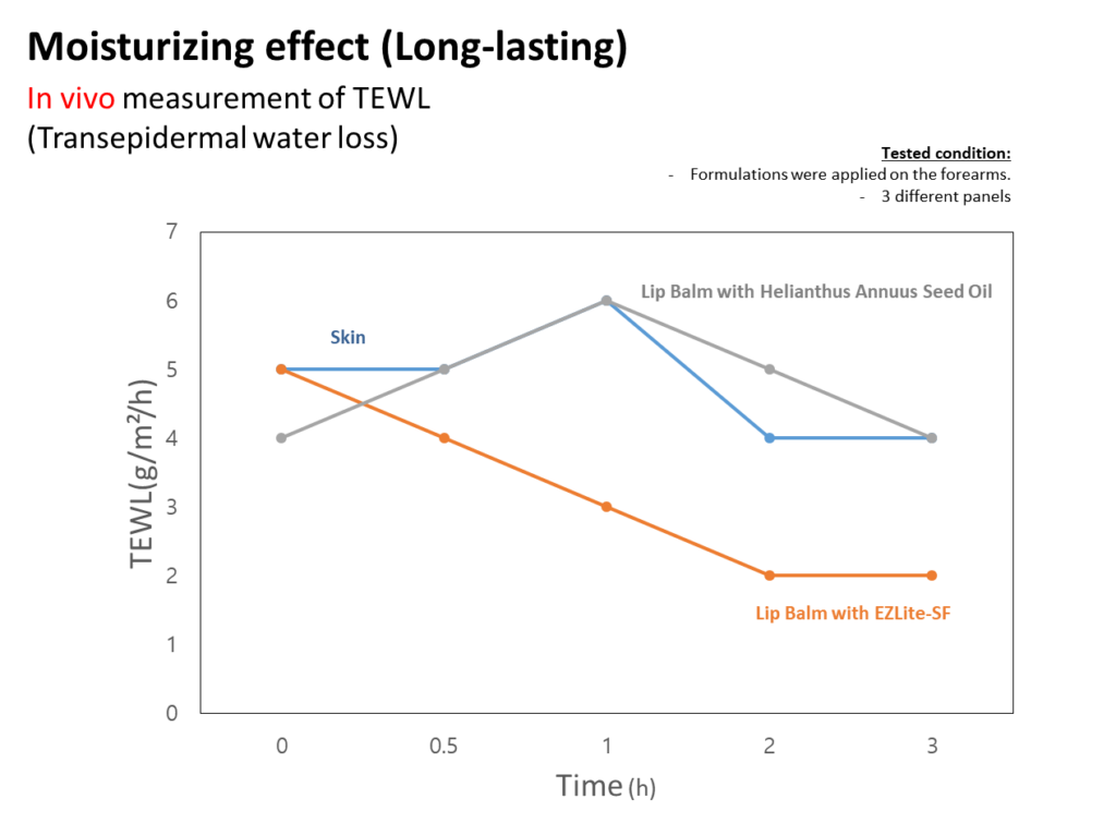 EZlite-SF를 사용한 립밤은 경피 수분 손실(TEWL) 테스트 결과, 해바라기유 기반 립밤 대비 시간이 지날수록 수분 손실이 현저히 적음을 입증했습니다. 이는 EZlite-SF가 탁월한 촉촉함과 보습 지속력을 제공한다는 것을 의미합니다.