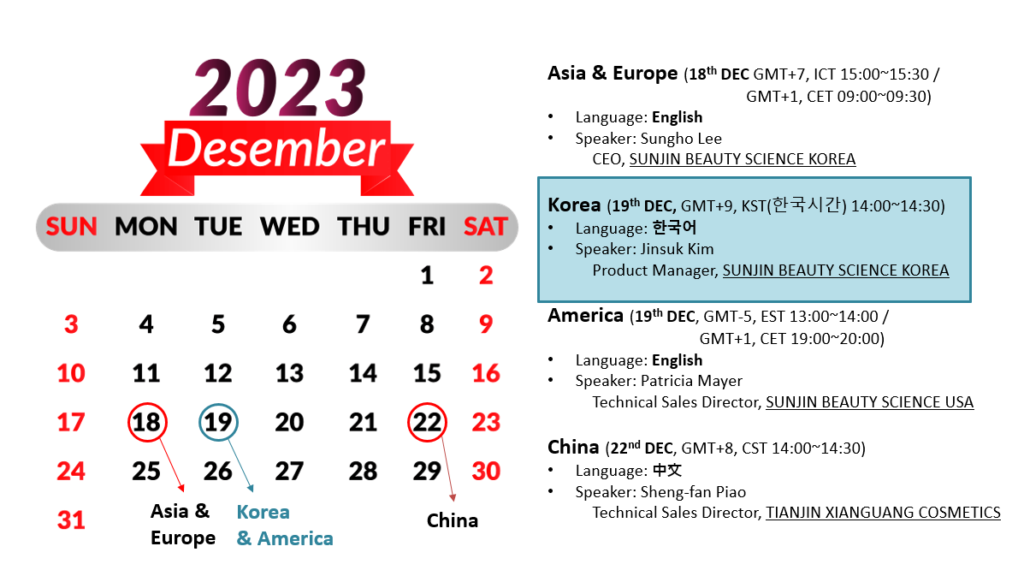 아래와 같이 3가지 언어로, 4종류의 시간대로 세계 각국의 고객들이 참여할 수 있도록 웨비나 프로그램을 구성하였으니 자세한 내용을 12월 진행되는 웨비나에서 확인하세요!
