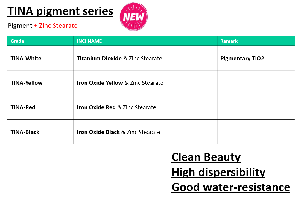 TINA 시리즈는 기존에 보편적으로 사용되던 Alkyl Silane 코팅의 피그먼트들과 동일한 수준의 발수력을 가지고 있으면서, 클린뷰티 컨셉에 맞는 천연 코팅이라는 이점이 있습니다.