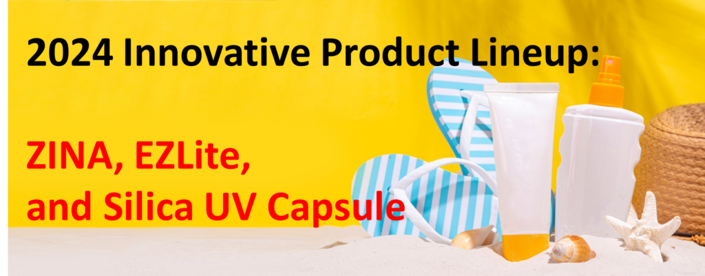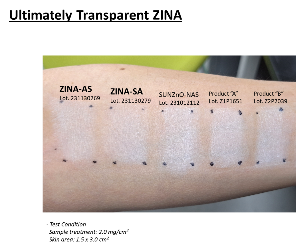 첫 번째로, 균일한 입자 사이즈를 통해 높은 자외선 차단력과 투명성을 자랑하는 ZINA 파우더와 분산액 시리즈를 선보였습니다. ZINA 파우더는 Alkyl Silane 코팅의 ZINA-AS, Stearic Acid 코팅의 ZINA-SA 두가지 버전으로 출시가 되었습니다. 이와 함께 선보인 ZnO 75%의 고함량 분산액 4종(ZINA-75AB, ZINA-75B, ZINA-75C5, ZINA-75CC)은 다양한 에몰리언트 베이스로 구성되어있으며, 점도가 낮아 사용이 간편합니다.