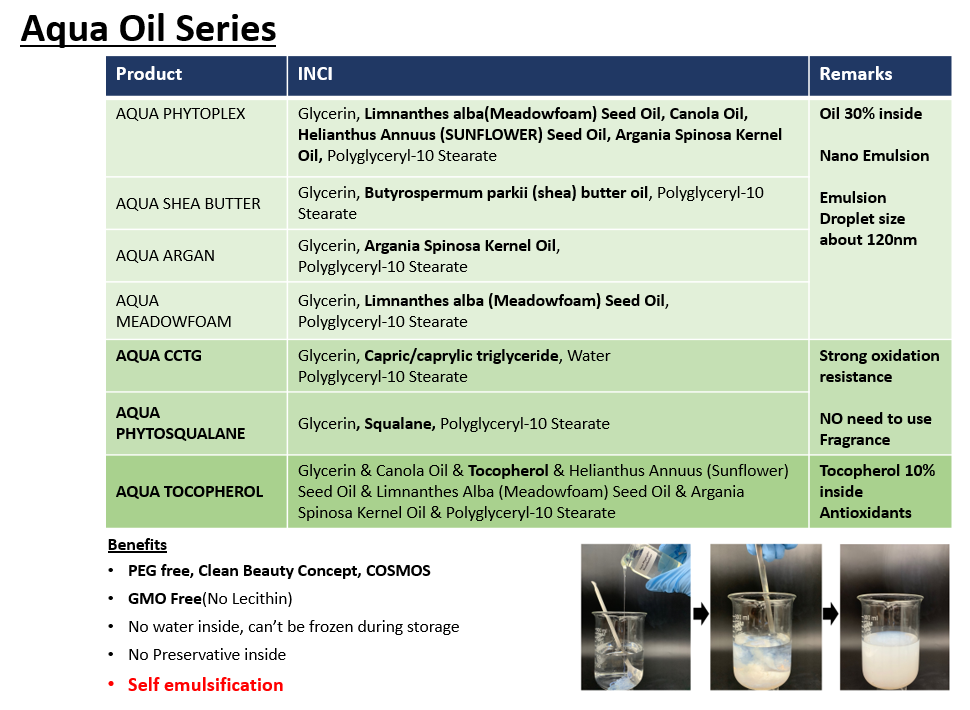 두번째 제품인 AQUA Oil 시리즈는 고압의 Homogenizer 및 가열 공정 없이 물에 간단히 풀어 사용하실 수 있는 나노 에멀젼 원료 입니다. 간단히 처방에 적용할 수 있고 다양한 처방에 적용이 가능한 이점으로 인해 많은 고객 분들이 관심을 보이셨습니다.