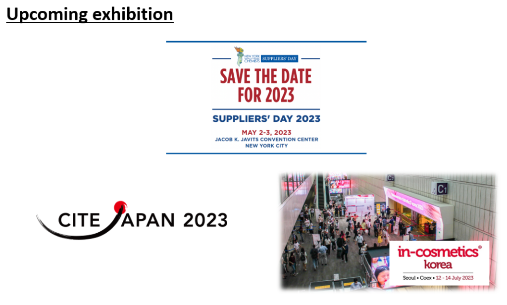 다가오는 5월 2일~3일에는 뉴욕 Suppliers’ day, 5월 17일~19일에는 일본 요쿠하마에서 열리는 CITE Japan, 7월 12일~14일에는 in-cosmetics Korea에서 더욱 다양한 신제품 및 처방으로 찾아 뵙겠습니다!