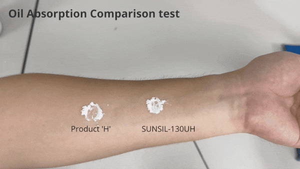 SUNSIL-130UH는 흡유량이 3.0~3.5cc/g에 달해, 기존 SUNSIL 시리즈 중 가장 높았던 SUNSIL-150H (1.4~2.1cc/g)를 크게 상회합니다. 이 독보적인 흡유력은 피부 표면의 과도한 피지와 유분을 효과적으로 흡수하여, 번들거림 없는 보송하고 매트한 마무리감을 선사합니다.