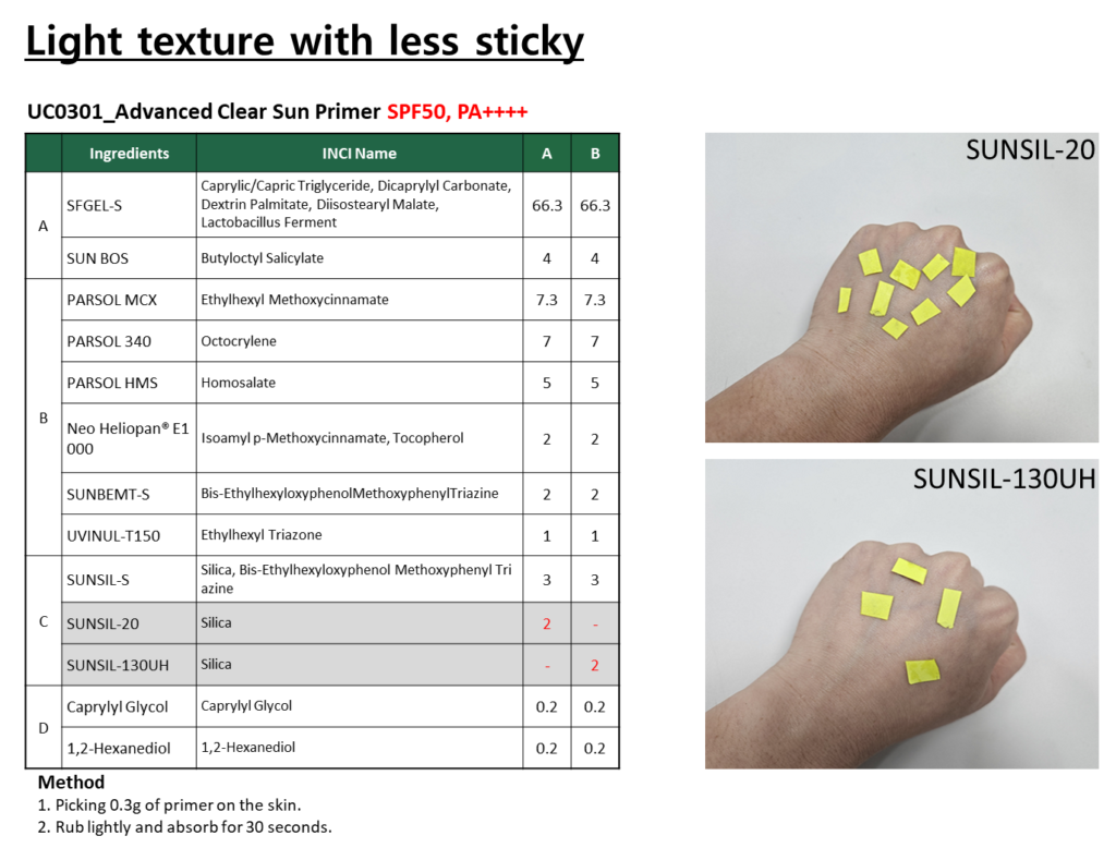 혁신적인 유분 컨트롤 솔루션을 찾고 계신가요? 메이크업 제품부터 스킨케어 제품까지 광범위하게 활용 가능한 SUNSIL-130UH를 만나보세요!.