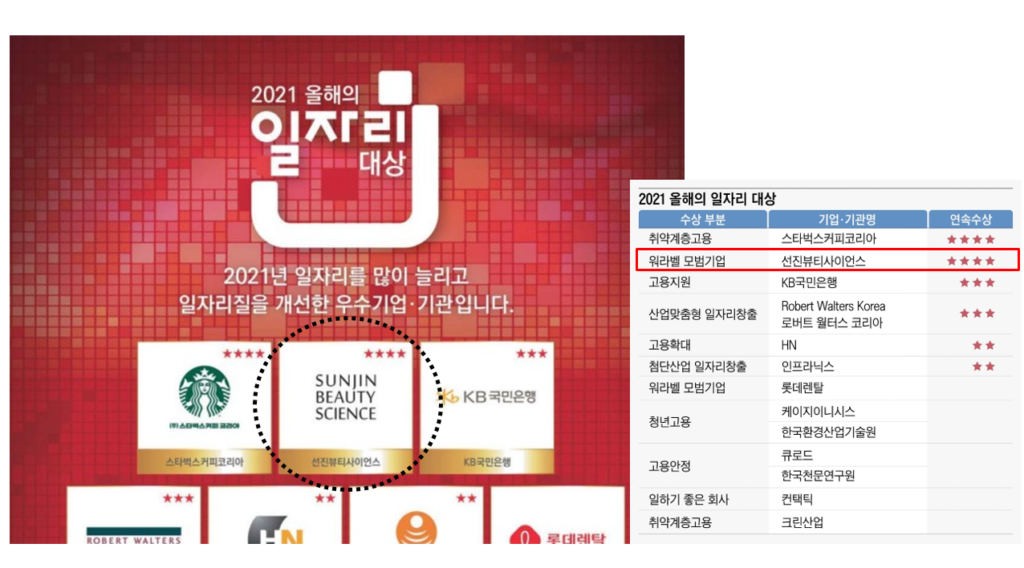 공공기관과 공기업, 대기업 및 우수 중견·중소기업 후보군을 대상으로 3차례 심의 , 선진뷰티사이언스가 4년 연속 올해의 일자리 대상 워라밸 모범기업에 선정되었습니다!