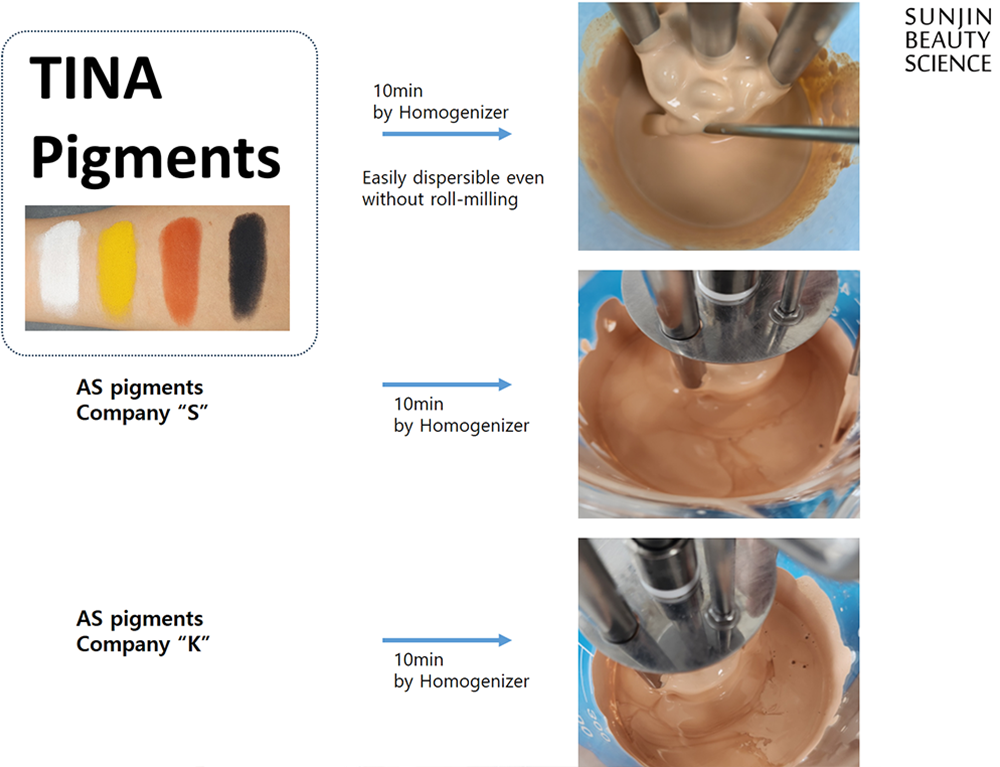 선진뷰티사이언스에서 색조 화장품(Make-up)에서 색을 표현하는 화장품 소재인 Pigment를 오일상에 잘 분산되도록 친유성 코팅한 파우더 형태로 제공할 뿐 아니라, 수상에도 쉽게 쓸 수 있도록 수분산시킨 분산액 형태로도 제공하고 있습니다.