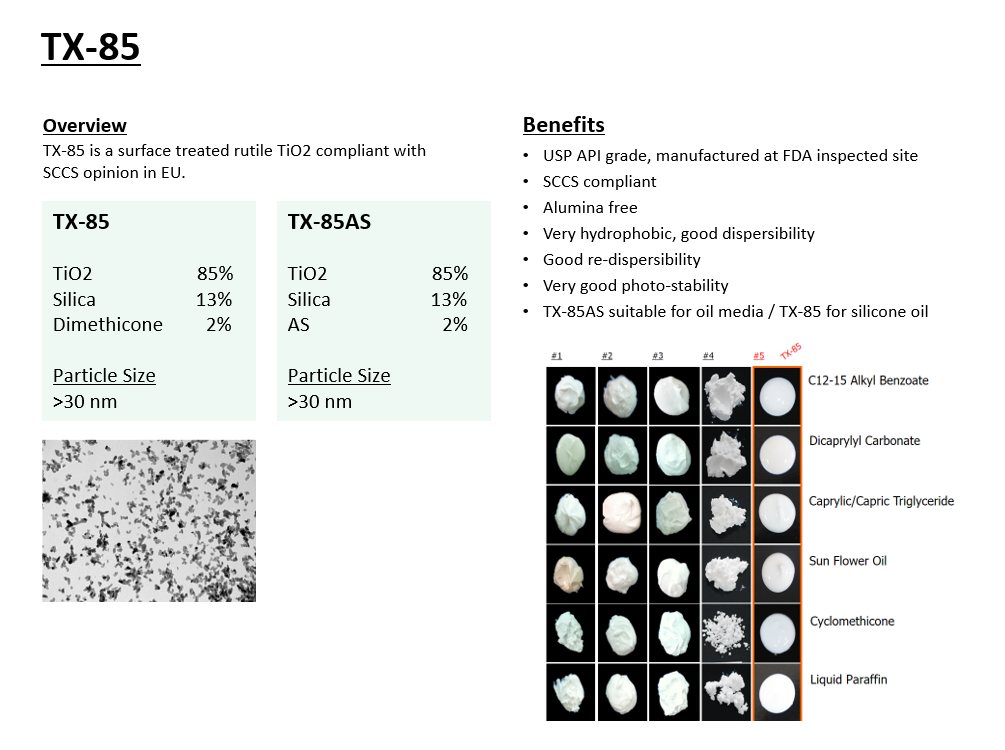 TX-85는 Silica 및 Demethicone으로 표면처리 된 30nm이상 사이즈의 나노 티타늄다이옥사이드 입니다. Alumina Free 처방에 사용 가능하며, SCCS Opinion을 만족하여 유럽에서 사용 가능합니다. 또한 각종 오일에 대한 분산성이 뛰어나 어떠한 처방에도 자유롭게 사용 하실 수 있습니다.