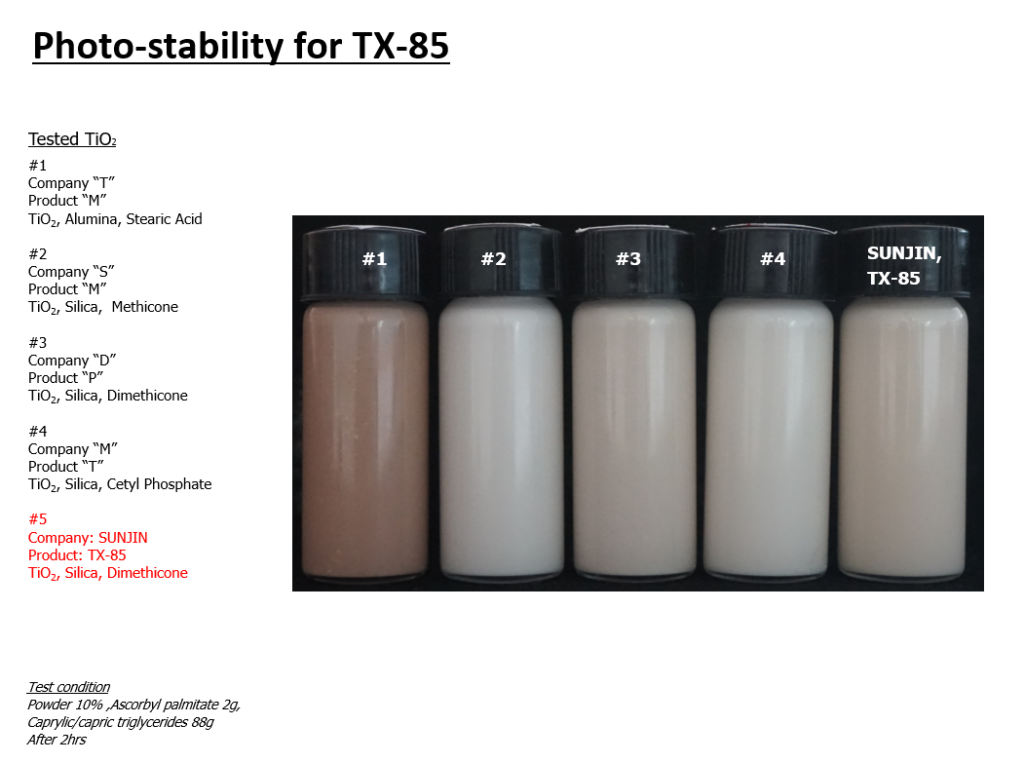 마지막으로 TX-85는 Silica 및 DMethicone으로 표면처리 되어 광안정성이 뛰어납니다. Ascorbyl palmitate와 Caprylic/capric triglycerides에 파우더 10% 투입 두시간 후, 색상 변화가 적게 나타남을 확인할 수 있습니다.