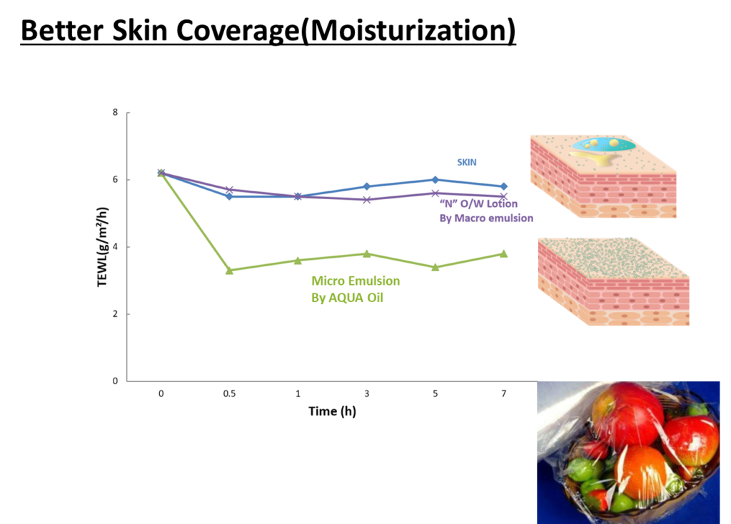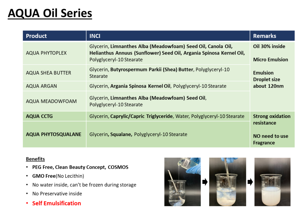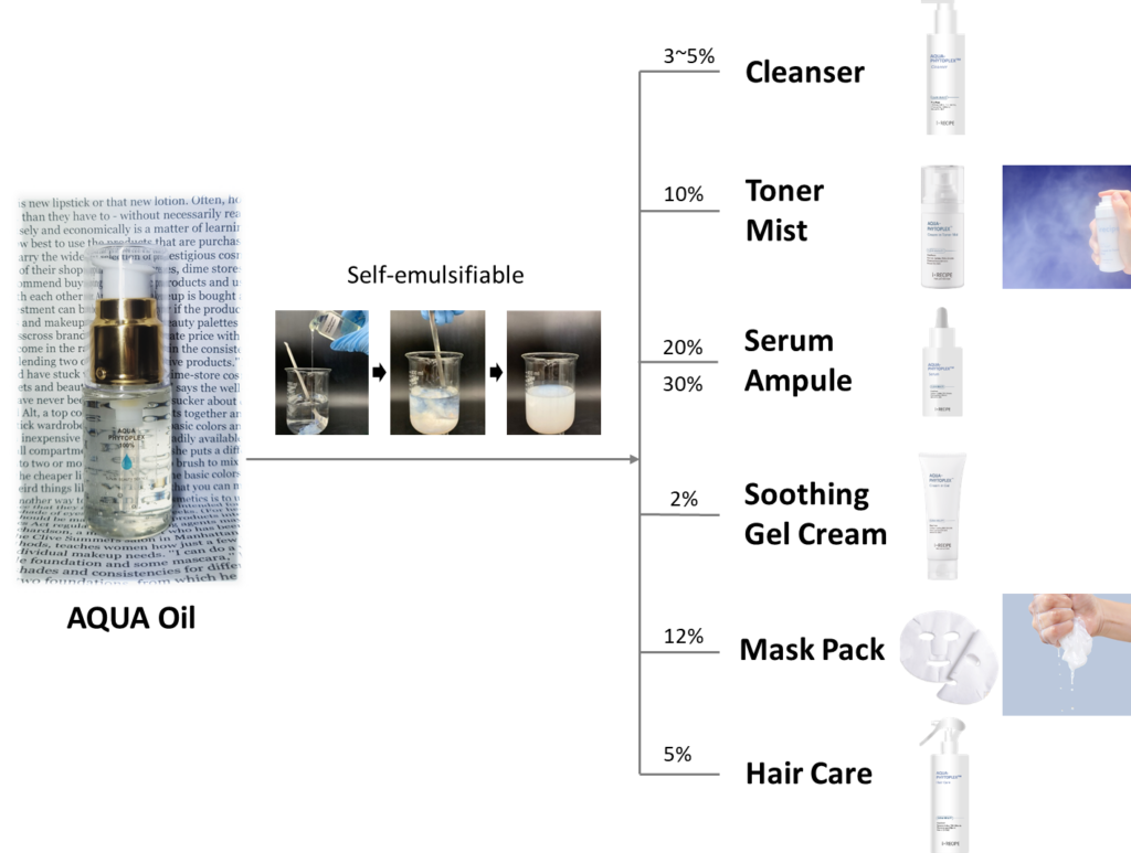 AQUA Oil은 반투명한 Micro-emulsion으로, 특수한 유화 장비 없이 단순한 교반만으로 천연 보습 오일을 수상(Water phase)에 균일하게 혼합할 수 있는 혁신적인 소재입니다.