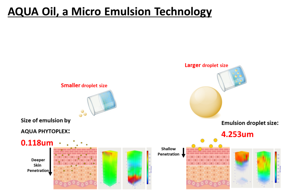 이러한 특성은 0.118μm의 미세한 입자 크기에서 비롯되며, 이는 일반 에멀젼(약 4.253μm)과 비교해 현저히 작은 수준입니다. AQUA Oil의 Micro-emulsion 기술은 제형 적용 시 피부 흡수력을 크게 향상시켜 더욱 효과적인 보습, 탄력 개선과 영양 공급을 가능하게 합니다.